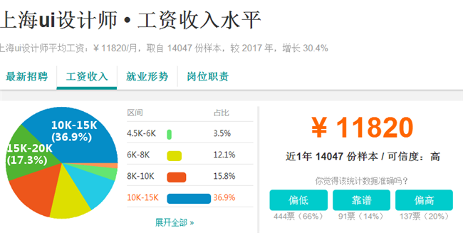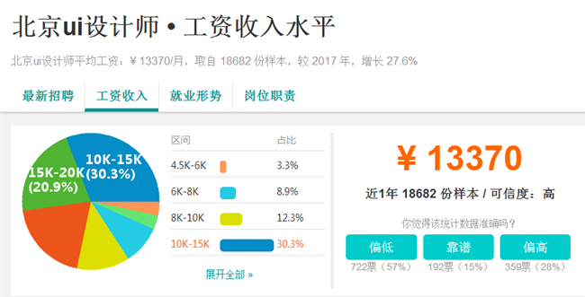 UI設計師的薪金待遇位居國內高收入職業的前列。目前,一名設計師的平均月薪在5000元左右,若有能力勝任更高的職位,如設計部門主管、創意部門總監等,其平均月薪一般不會低于10000-15000元人民幣。