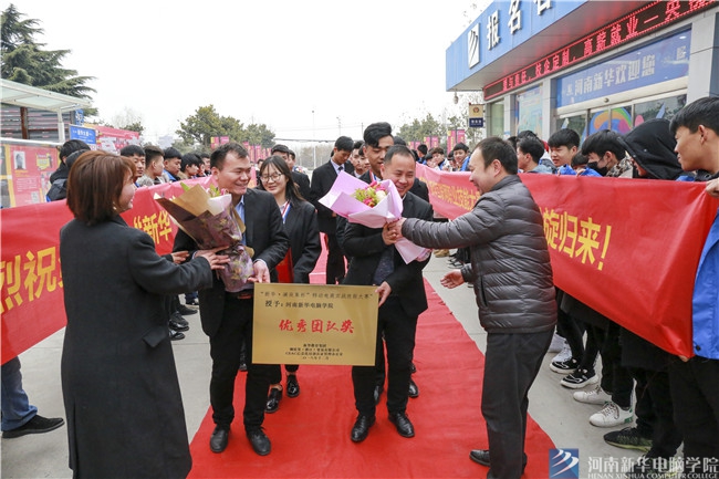 12月25日,河南新華電腦學(xué)院校門處熱鬧非凡,新華師生懷抱著鮮花翹首以待,熱情迎接在“新華·瀾庭集杯”互聯(lián)網(wǎng)職業(yè)技能大賽中載譽(yù)歸來的河南新華電腦學(xué)院代表隊!
