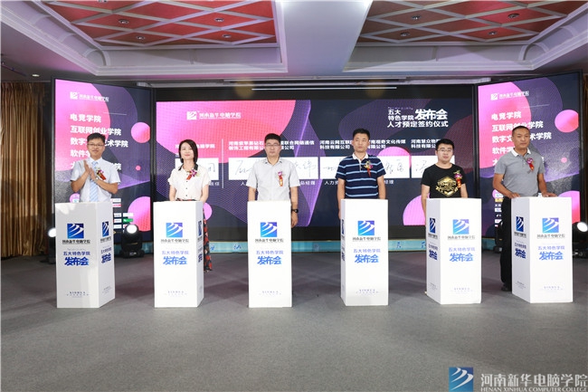 在發布會現場,河南紫蘋果鉆石裝飾工程有限公司、中國聯合網絡通信有限公司鄭州分公司、河南云網互聯網絡科技有限公司、河南觀奇文化傳媒有限公司、河南慧眾物聯網科技有限公司與河南新華電腦學院簽署了人才預定協議,現場分別預定數字文創藝術學院、大數據智能學院、互聯網創業學院、電子競技學院、軟件學院的學生。此次校企人才預定協議的簽署,讓學生可以對口就業,解決了企業人才引進的問題,形成了學校、學生、企業三方共贏的局面。