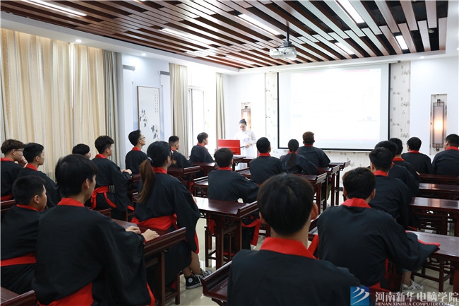 “物格而后知至,知至而后意誠(chéng),意誠(chéng)而后心正,心正而后身修,身修而后家齊,家齊而后國(guó)治,國(guó)治而后天下平。”7月4日,河南新華電腦學(xué)院國(guó)學(xué)教室里,受邀而來(lái)的河南省先鋒國(guó)學(xué)文化研究院副院長(zhǎng)翁晴正在為學(xué)生們上主題為《置心一處,臻于至善》的國(guó)學(xué)課。